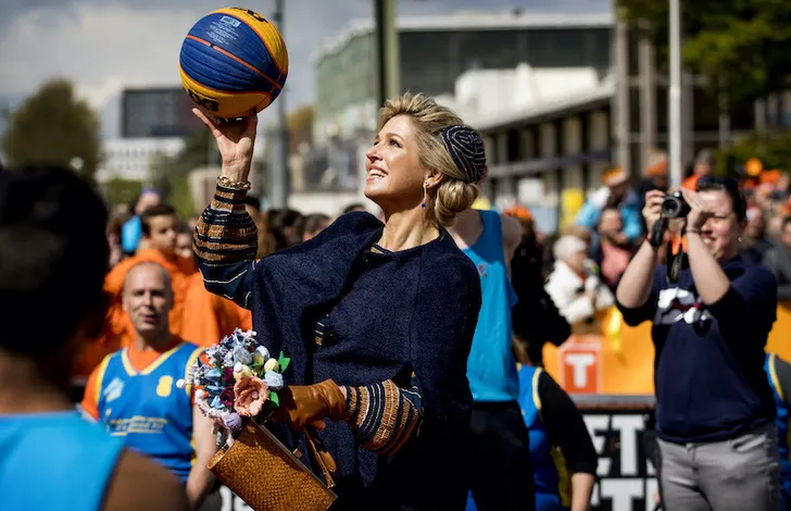 Met haar lengte kan Majesteit zomaar een prima basketballer zijn, hier op Koningsdag 2017