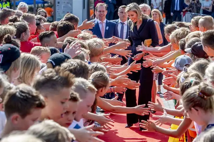 Koningin Máxima was vanochtend (woensdag) in Zevenaar voor de ondertekening van het convenant Méér Muziek in de Klas. En viel daar, tussen de zomers geklede kinderen, op in een donkere outfit.