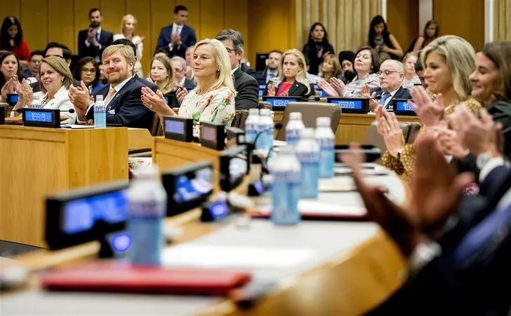 2019: een bijzonder jaar, want Majesteits tiende jubileum bij de VN. Willem-Alexander vloog mee om het te vieren, en Mabel was er ook voor de familie-support. De look van Máxima: Valentino.