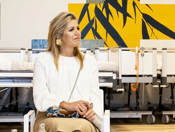Majesteit houdt wel van opvallende sieraden. Dus was het bepaald geen verrassing dat ze vorige week ten tonele verscheen (in een ingetogen ziekenhuis nog wel) met heerlijke gouden bladeren bungelend in heur haar.