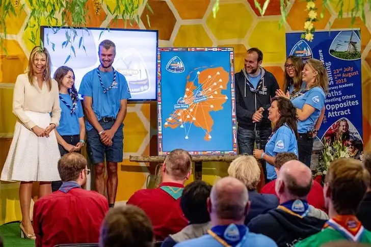 De koningin toog naar Voorburg (op maar 15 minuten van de Eikenhorst, heerlijk zo vlak voor de vakantie) om een bijeenkomst bij te wonen van de organisatie van Roverway 2018. Dat is een internationaal evenement voor scouts uit heel Europa, dat dit jaar plaatsvindt in Nederland.