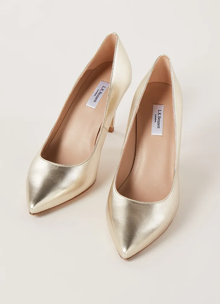 Gouden floret-pumps van hertogin Kate's favoriete schoenmerk L.K. Bennett (Bijenkorf € 265)