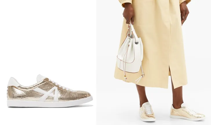 Aquazurra sneaker met slangenleereffect in goud (Matches Fashion € 395)