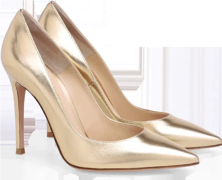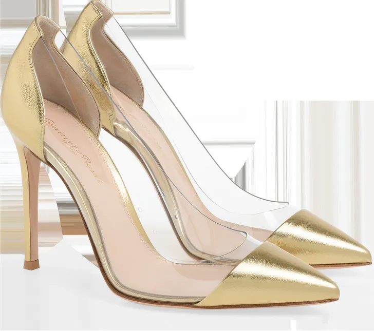 Het exacte model dat Máxima draagt zit niet langer in de collectie, maar Gianvito Rossi heeft nog wel haar favorieten plexi-pump in goud (€ 695)…