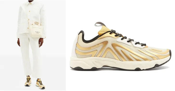 Voor de thuiswerker die snakt naar een vleugje glam: gouden sneakers van Acne (Matches Fashion € 340)