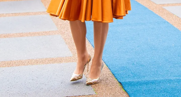 Koningin Máxima droeg deze week haar trusty gouden Gianvito Rossi's naar een werkbezoek, wat goed was voor menig glimlach.