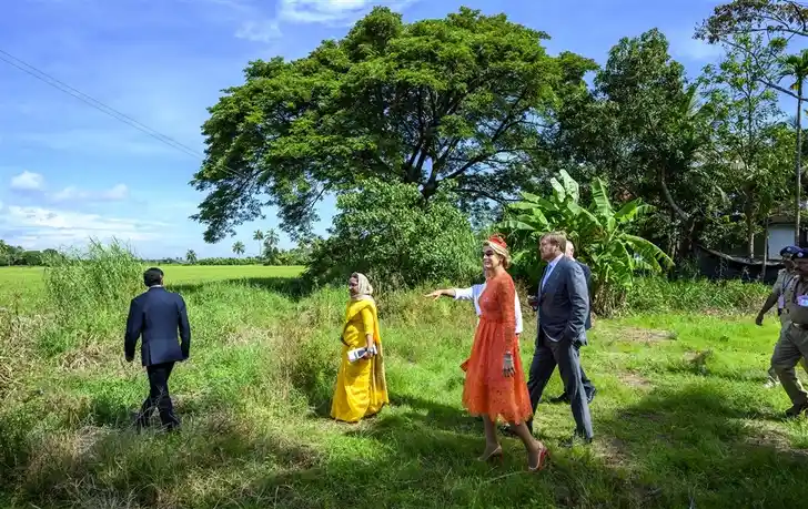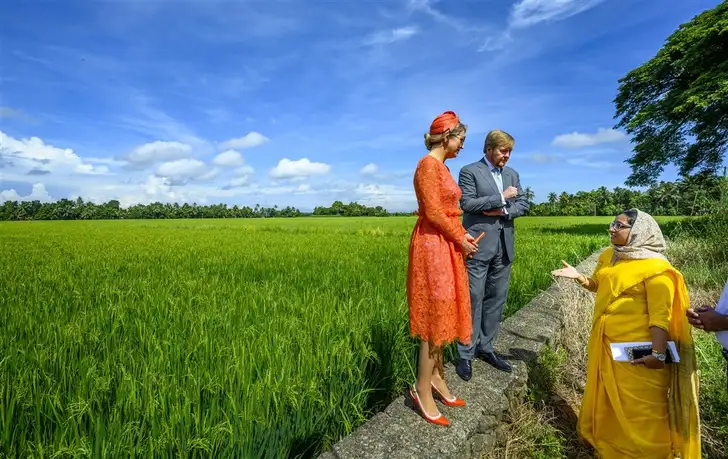 …werd de reis afgerond met een bezoek aan een rijstveld in Alleppey. Maxima droeg een luchtige kanten Natan met bijpassende slingbacks...