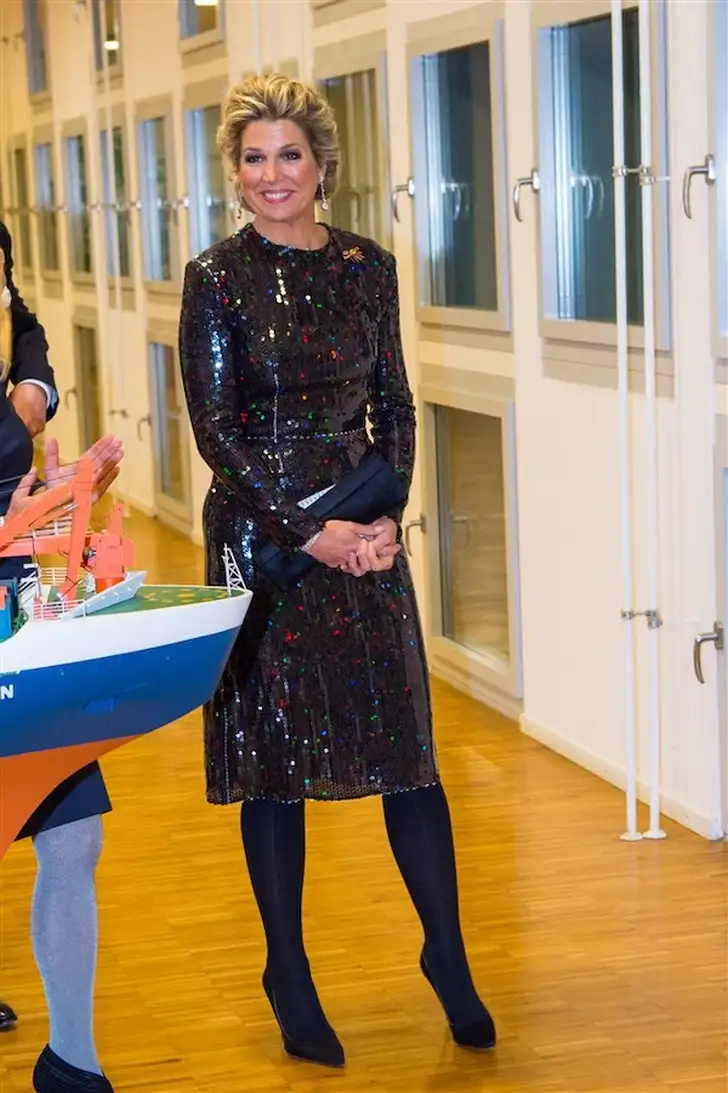 De jurk is van designer Nina Ricci, en hangt al wat langer bij de koningin in de kast. Ze droeg 'm onder andere al tijdens een eerder werkbezoek aan Duitsland, in 2017. Hij is volledig bedekt met pailletten, die de bruine jurk een meerkleurig effect geven.