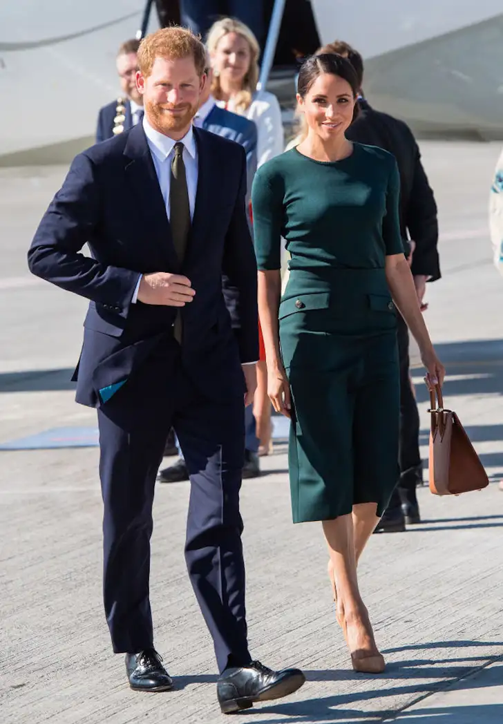 Voor ons betekent dat volop gelegenheid om Meghan in prachtige nieuwe outfits te zien (alles is nog nieuw, bij haar). Zo koos ze heel passend voor een groen ensemble van Givenchy toen ze uit het vliegtuig kwam. Voor het chique tuinfeest switchte ze naar een zwarte Emily Wickstead.