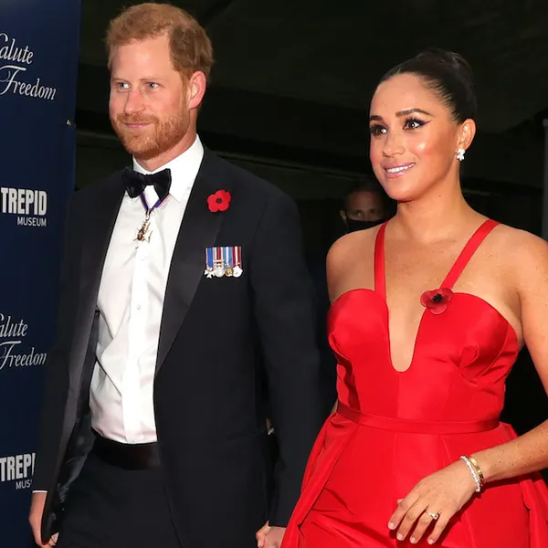 Hertogin Meghan verscheen in een rode jurk van Carolina Herrera. Een designer die ze ook in haar tijd als royal graag droeg, al had deze halslijn toen wellicht niet door de beugel gekund. Met Harry ernaast in een zwarte smoking én hun matching rode klaprozen (voor de Britse Remembrance Day) was het een dijk van een plaatje.
