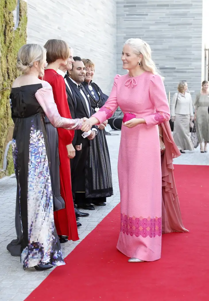 Mette-Marit droeg de jurk van Noorse ontwerper Peter Dundas naar het openingsgala van het nieuwe Nationale Museum. De stof van de jurk blijkt met de hand te zijn geweven door Aurora Verksted, van honderd procent Noorse wol (je voelt hier vast al een thema aankomen).