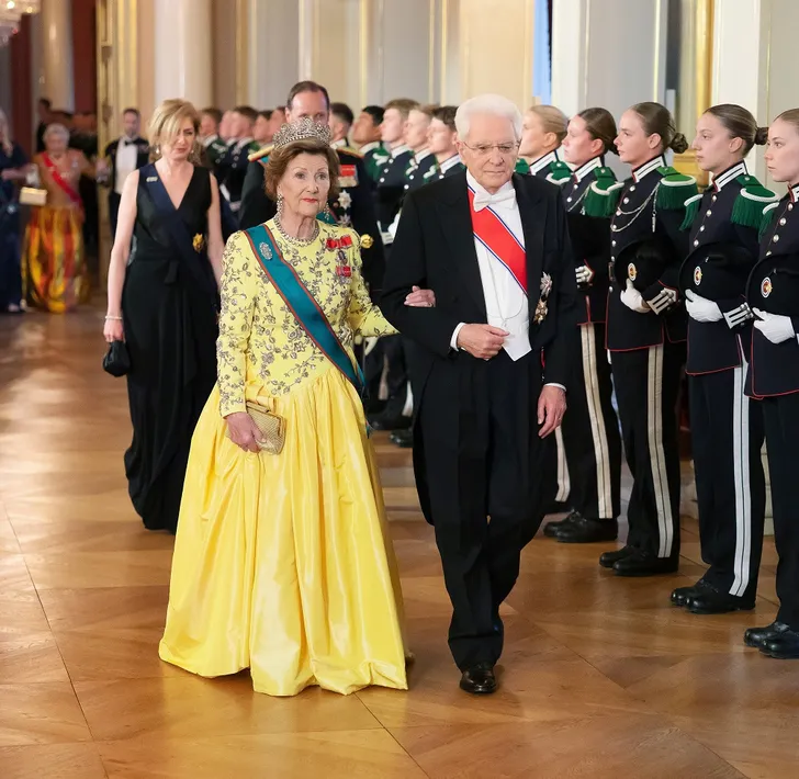 Voor de avond gooide Sonja een Dundas-design op repeat, met de Queen Josephine Tiara, want why not? Naast haar de Italiaanse president Sergio Mattarella.