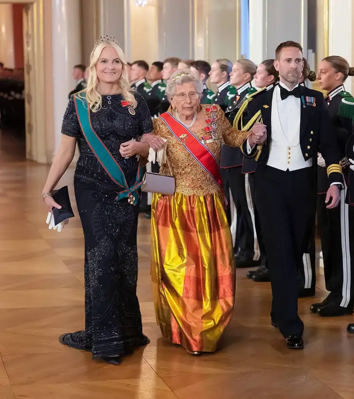 Ook Mette-Marit hield zich niet in en droeg een donkerblauwe Emilio Pucci by Peter Dundas met de Amethyst Necklace Tiara die – de naam zegt het al – ook als collier kan worden gedragen. Prinses Astrid is, net als haar broer Harald, niet meer zo goed ter been, maar werd liefdevol ondersteund.
