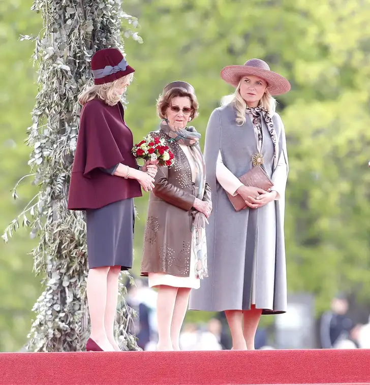 Koningin Sonja liet zich overigens ook niet onbetuigd, zij verscheen later op de dag in een klassiek Bar jasje van Dior met een Chaneltasje.
