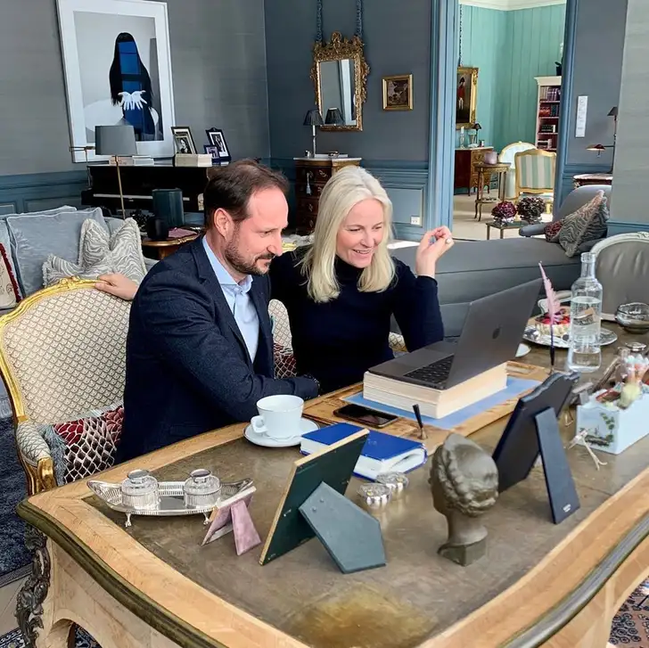 De Noren doen dat beter: kroonprins Haakon en kroonprinses Mette-Marit hebben van Skaugum hun eigen mediahub gemaakt die een lief inkijkje geeft in hun leven daar. Zo is minimalisme duidelijk niet hun ding. Moeten de volstrekt niet ergonomische fauteuiltjes met een kussentje wat comfortabeler worden gemaakt bij een videocall. En zijn ze zo slim de laptop iets hoger te zetten, dat de royal neusgaten niet prominent in beeld komen. In de kamer veel portretten van dierbaren, opvallende moderne kunst en een bureau dat traditie uitstraalt, compleet met ganzenveer en inktstel.
