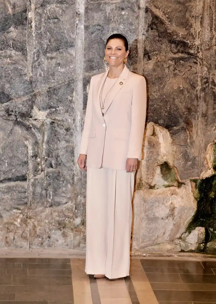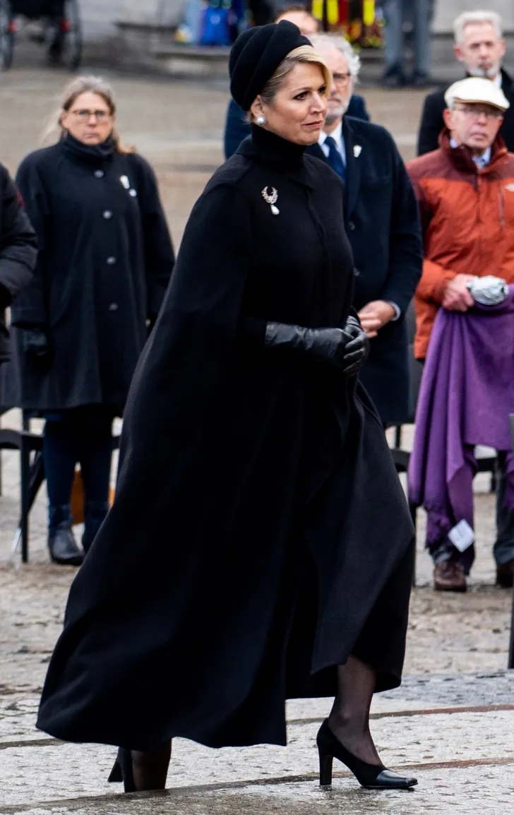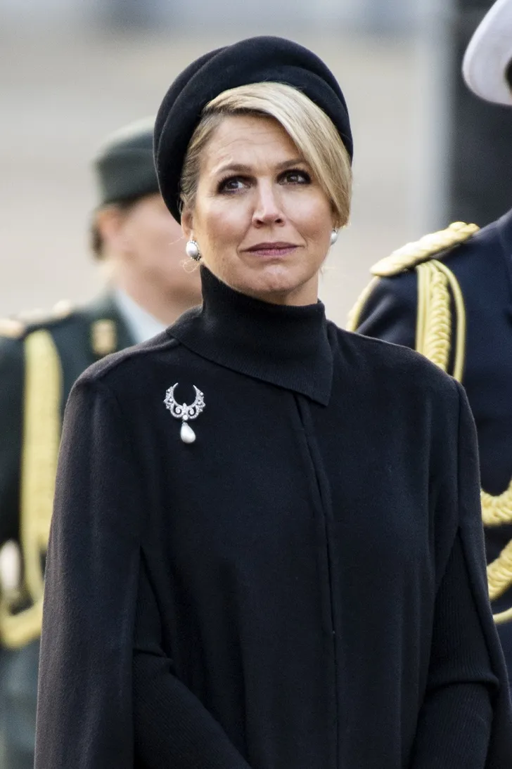 Haar cape kennen we van het concert op Koningsdag, en qua juwelen koos ze voor parels. Vast geen toeval, want aan het hof staan parels symbool voor de traan.
