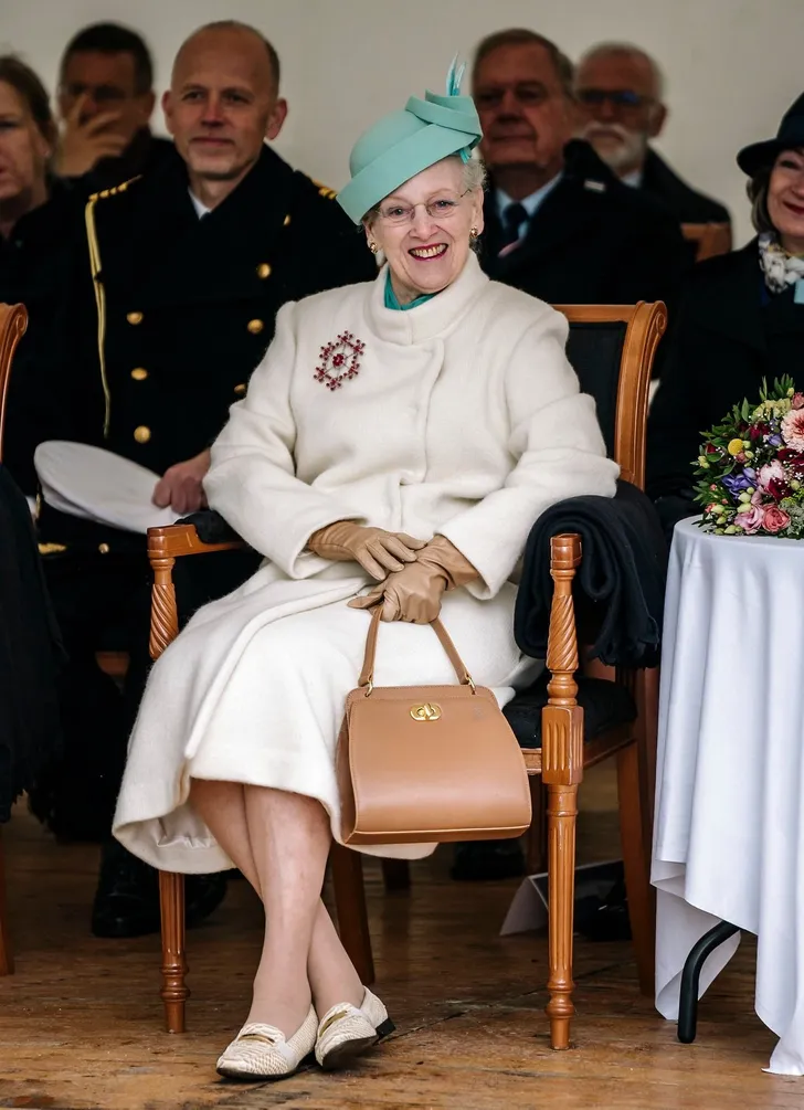Op 5 mei ging ze op pad in een witte jas, die werd gecombineerd met een rode broche en een groenblauwe hoed. Een wonderlijke mix van kleuren, maar voor een koningin die wel wat wegheeft van een schattig bloemenvrouwtje is het eigenlijk best een veilige look.