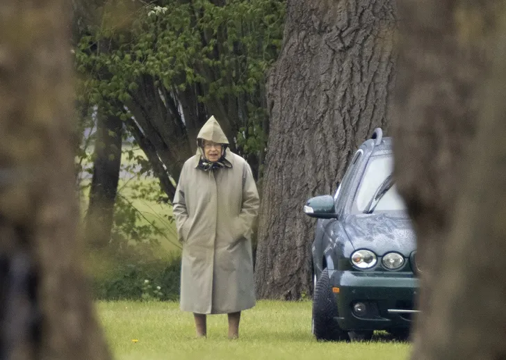 Tijdens de inspectie van de koets en paarden van haar overleden man droeg de Queen deze week dan ook geen zwart mantelpak, maar gewoon haar legergroene regenjas.