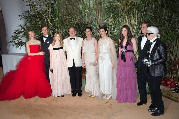 Caroline (midden naast broer Albert) met haar kinderen en schoonkinderen, en helemaal op rechts Karl Lagerfeld.