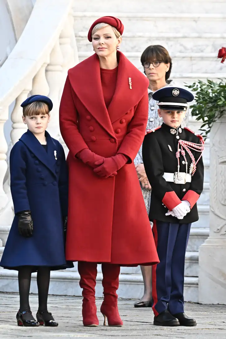 Prinses Charlene was de absolute ster van de dag in een rode jurk en mantel. Het label is nog niet bekend, maar aangezien haar dochter prinses Gabriella (bijna 9) een donkerblauwe kopie droeg, is het speciaal voor hen gemaakte couture. De hoedjes zijn van Stephen Jones. Hare Doorluchtige Hoogheid hoeft niet op de kleintjes te letten en heeft een begerenswaardig kledingbudget.