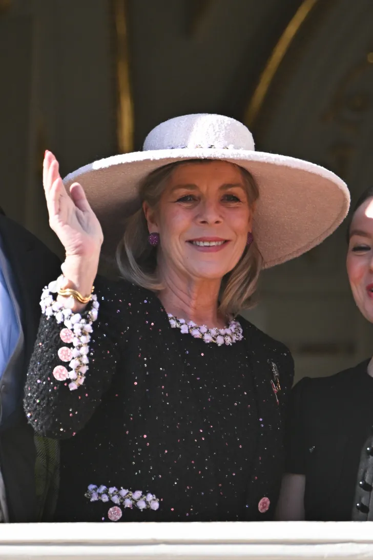 Ook prinses Caroline was beeldig als altijd, in Chanel. De originele look heeft een broek, Caroline maakte er een pakje van met een opvallende witte hoed.