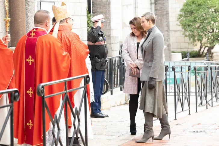… en vandaag ging Charlene, in très chic morning grey, samen met Melanie-Antoinette Costello de Massy (een nicht van Albert II en een vertrouweling van de familie) naar de Saint Dévote mis.