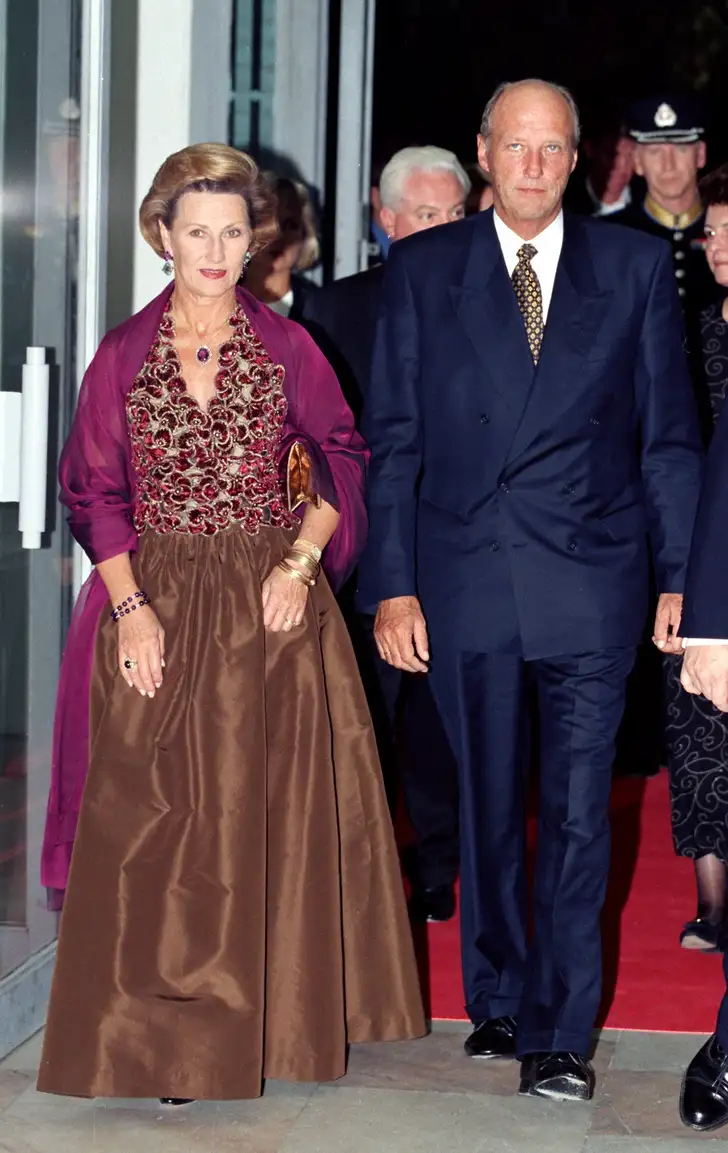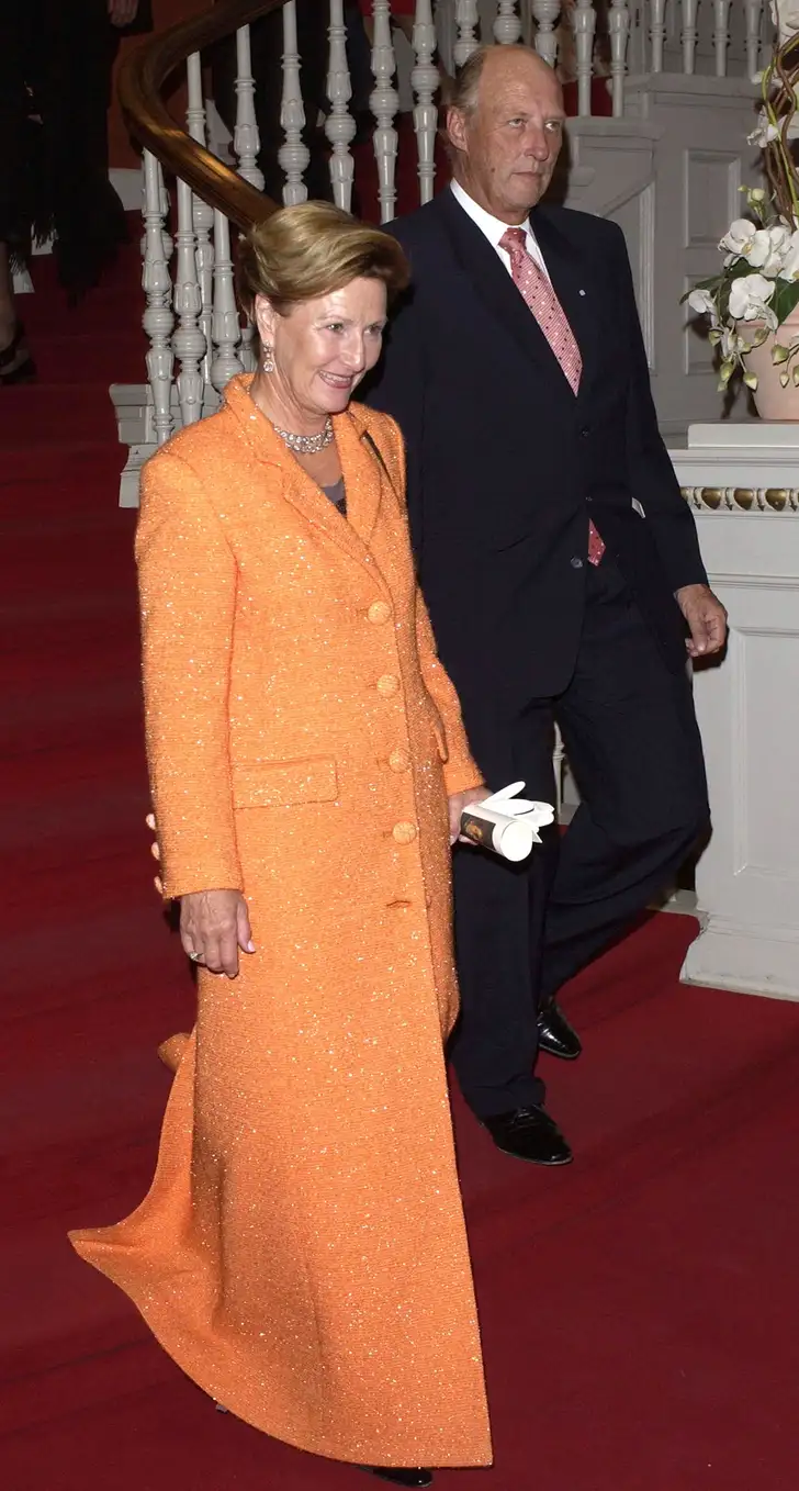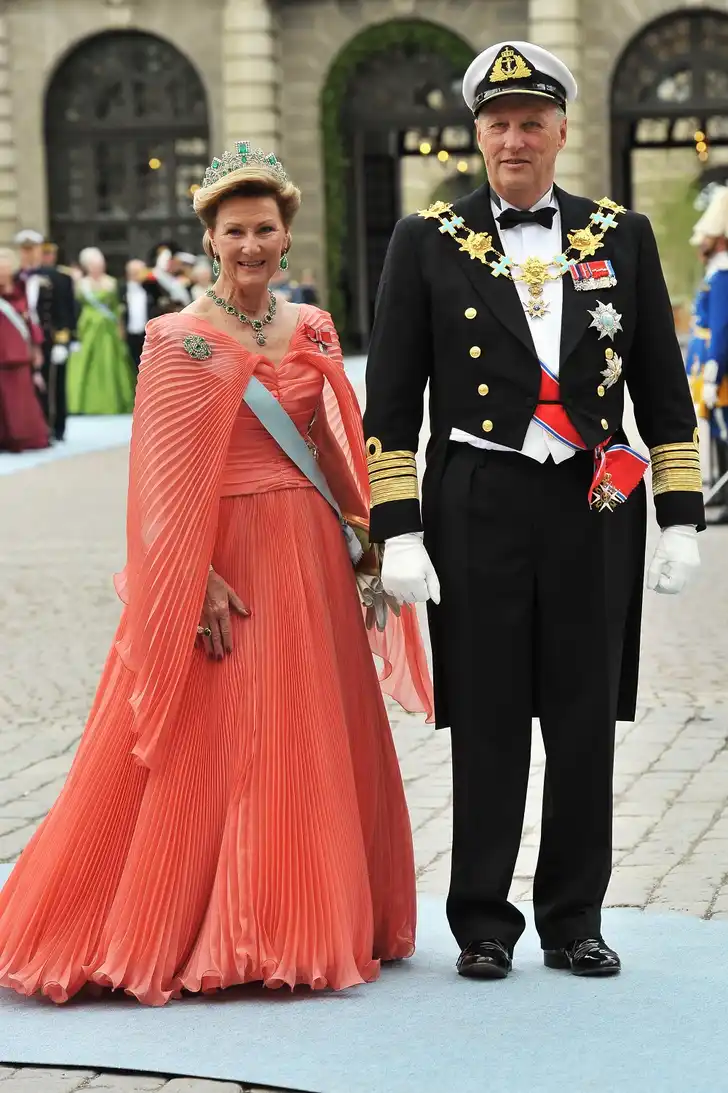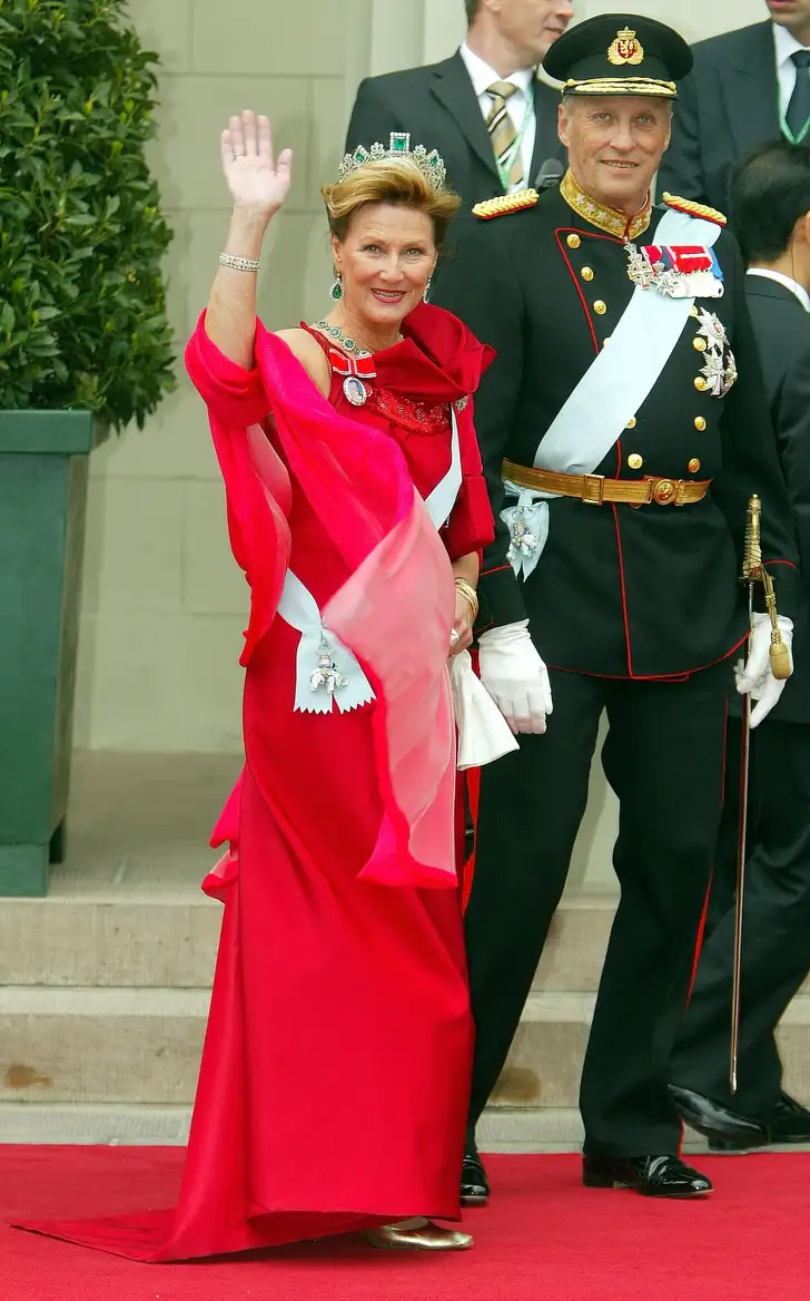 En deze nóg fellere kleur, die ze droeg op de bruiloft van haar zoon kroonprins Haakon met Mette-Marit. Check ook even de smaragden parure - topstuk van de Noren.