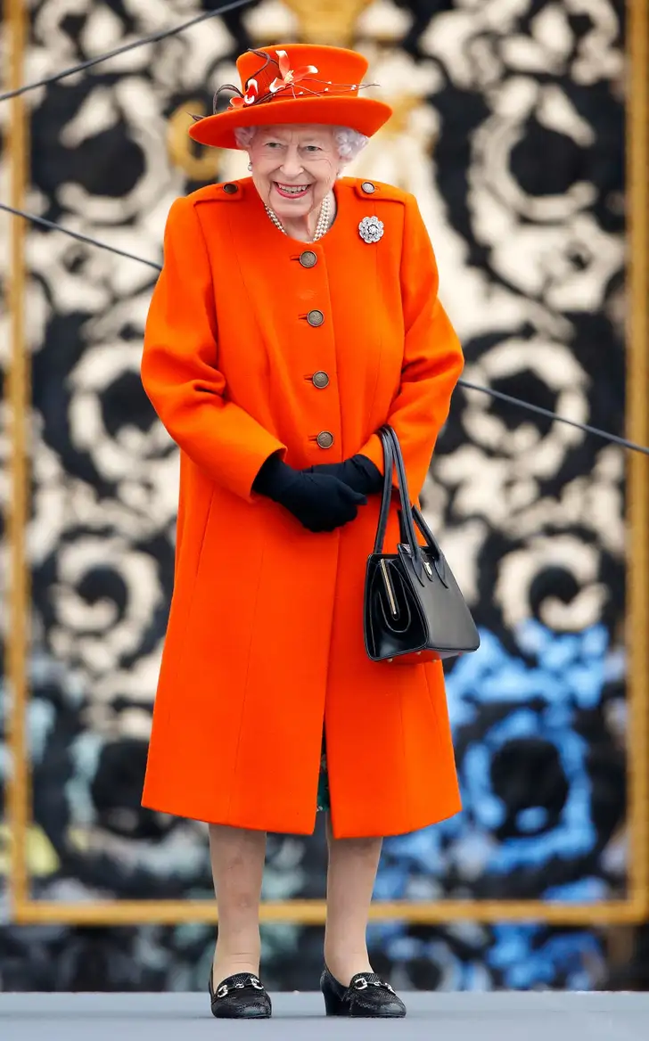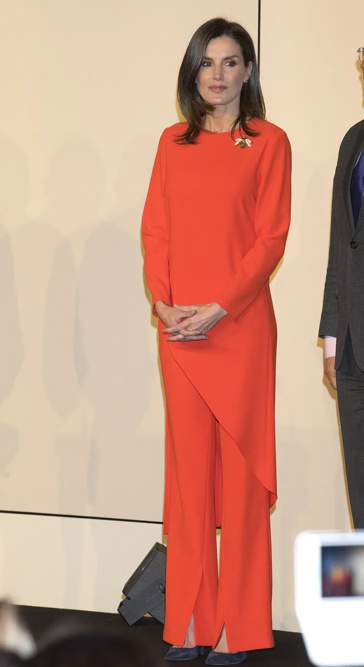 Koningin Letizia in een edgy oranje pak waarbij je meteen 'de koning van Hispanje heb ik altijd geëerd' wilt zingen.