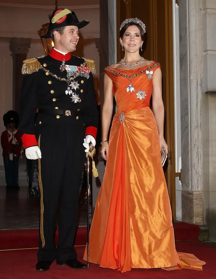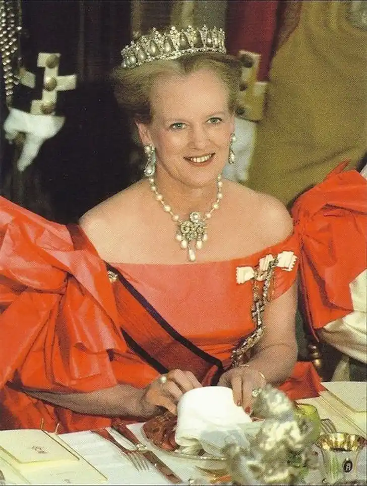 Koningin Margrethe in oranje. Het is niet terug te vinden waar dit staatsbanket plaats had, maar afgaand op de mouwen is het een back-to-the-eighties look.