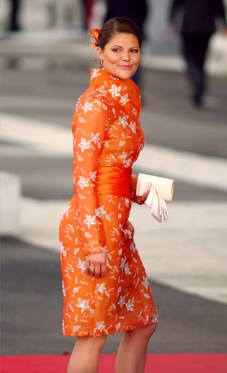 Kroonprinses Victoria van Zweden droeg oranje op de bruiloft van Letizia en Felipe van Spanje, in 2004.