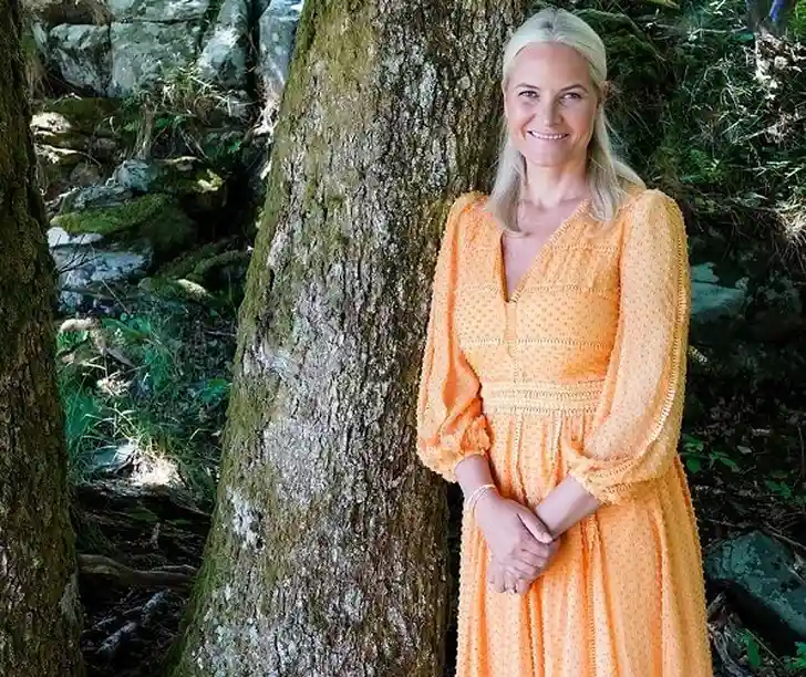 Mette-Marit, kroonprinses van Noorwegen, omarmt hier aan inner oranje voor een zomershoot.