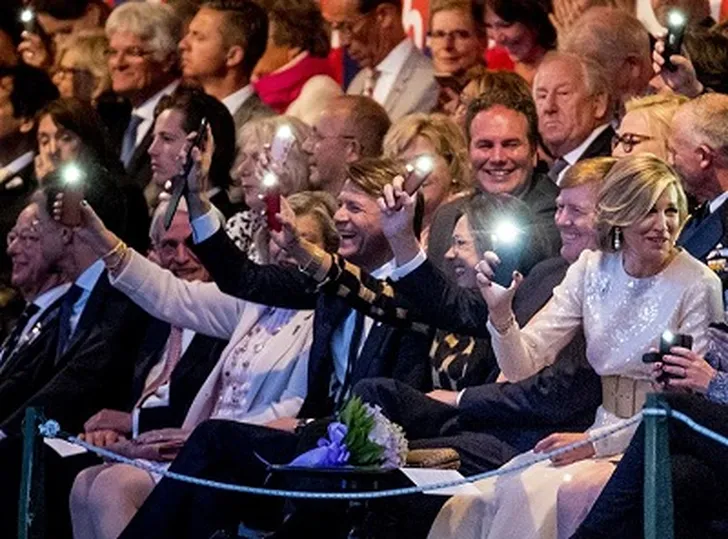 Het koningspaar hielp mee met een sfeerverhogend element toen ze de de 'zaklampfunctie' van hun mobiele telefoons inschakelden en meedeinde op de muziek van Lights will guide you home, uitgevoerd door CM Milton en Maan en Noa Wildschut op viool.