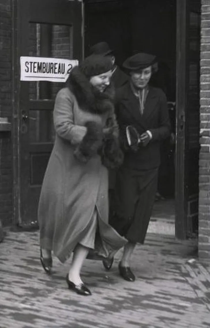 Juliana stemde als prinses wel - hier krijgt ze in 1935 in een stemlokaal in de Schoolstraat haar stembiljet...