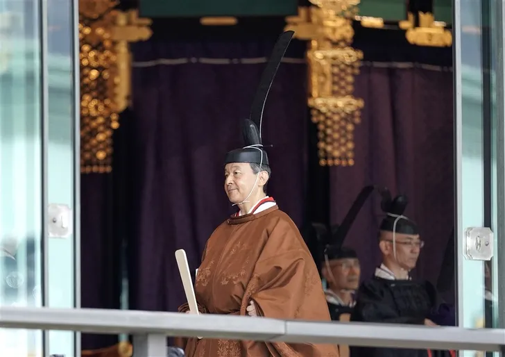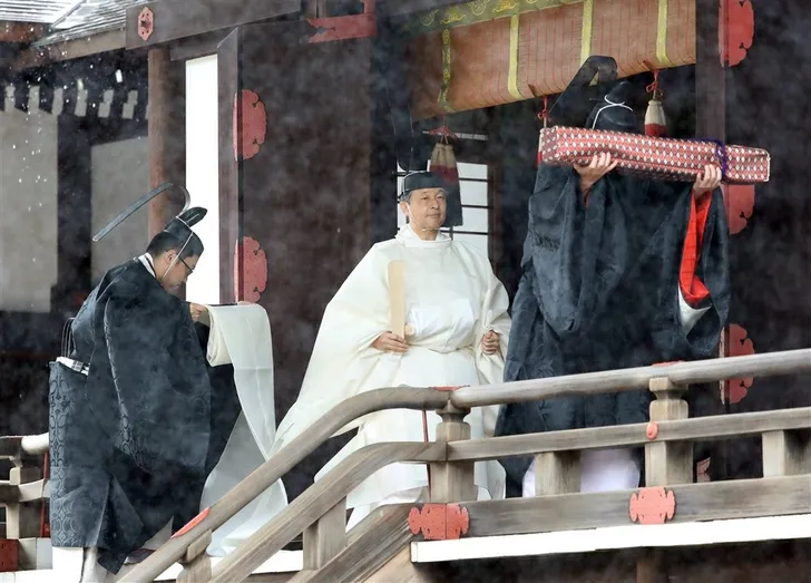 Naruhito las hierbij een tekst in het oud-Japans en beval de zielen van zijn voorouders aan bij de godin van de zon en andere godheden die te maken hebben met de inhuldigingsceremonie. De zon zelf liet het overigens afweten, het regende pijpenstelen.