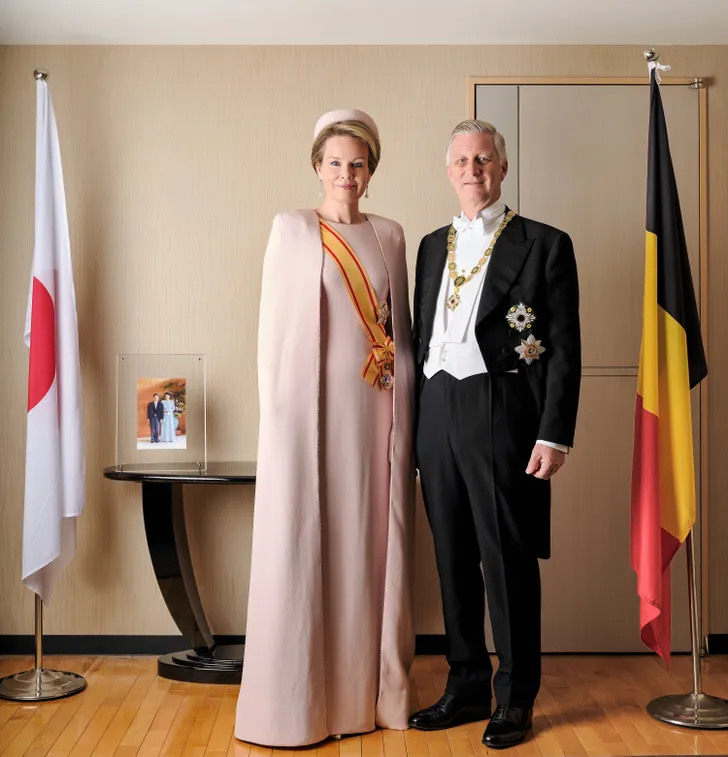 Koningin Mathilde koos voor een statige jurk-met-cape en ook koning Filip van België was rijkelijk versierd met ordes.