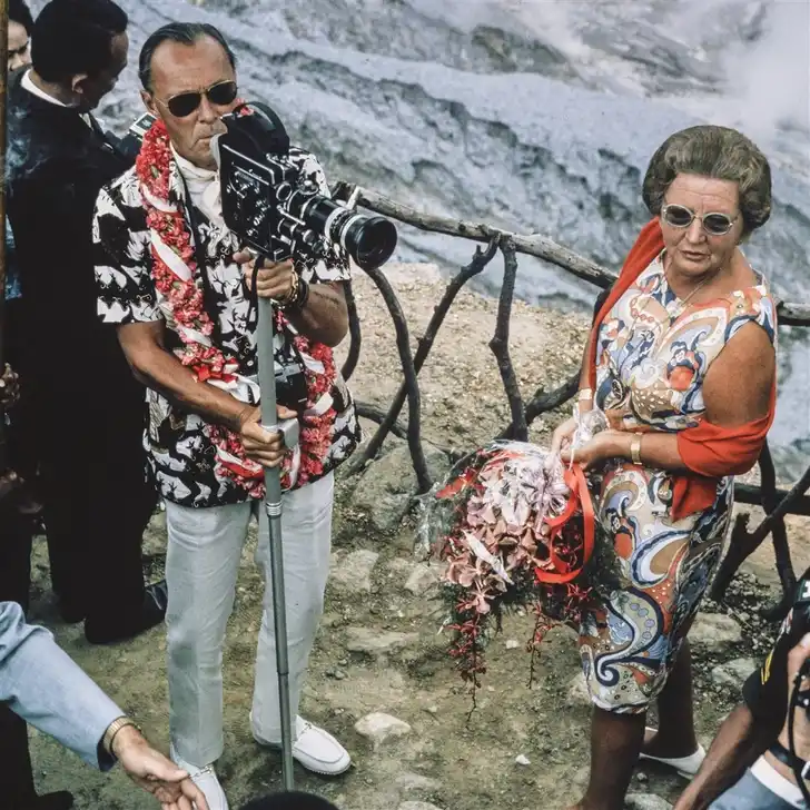 En aan het einde van het bezoek had het stel de plaatselijke mode helemaal omarmd. Bernhard staat hier bij Bandung vulkaan Tangkoeban Prahoe te filmen.