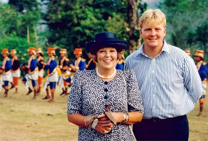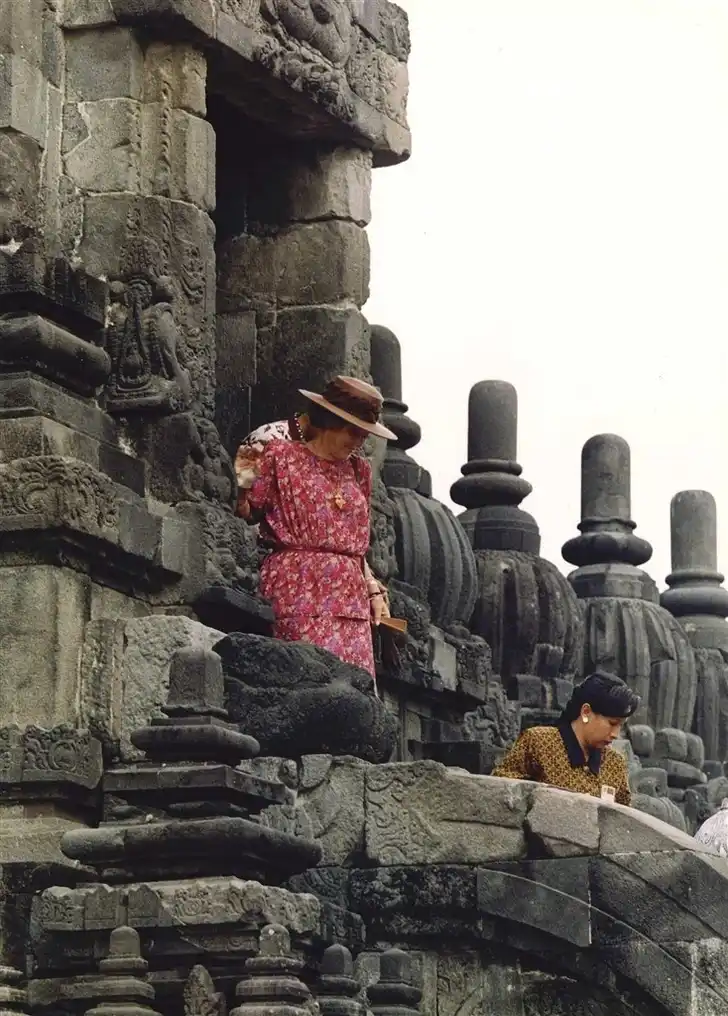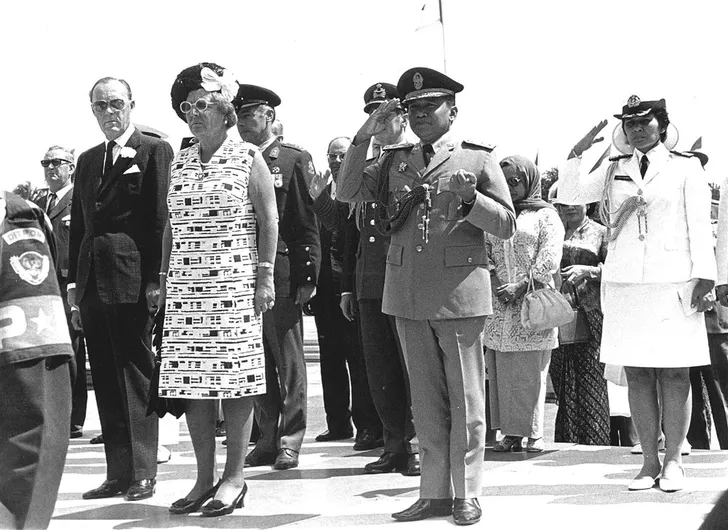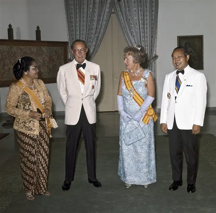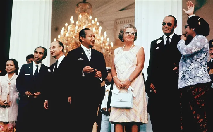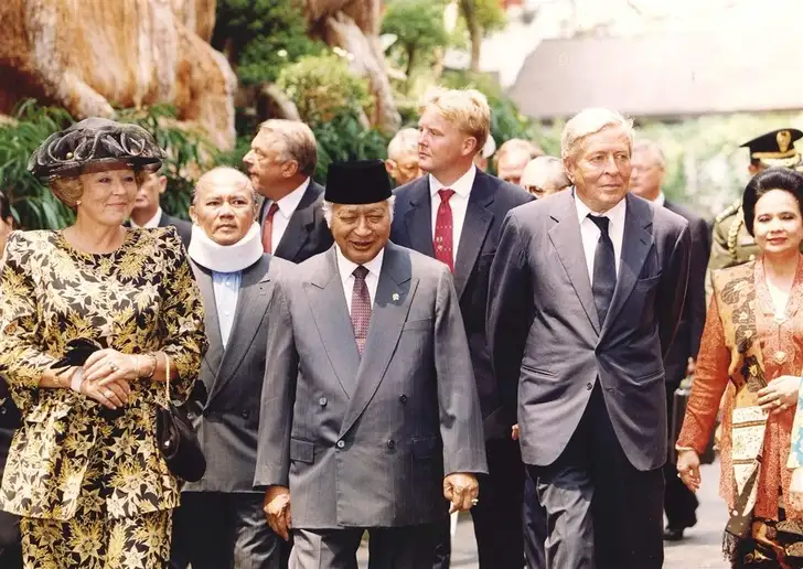 Koningin Beatrix bezocht het land in 1995. Gezien haar look had ze lak aan de tropische temperaturen, prins Claus had zijn das echter al een beetje los. In het midden president Soeharto.