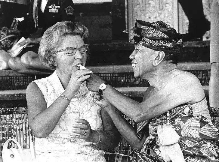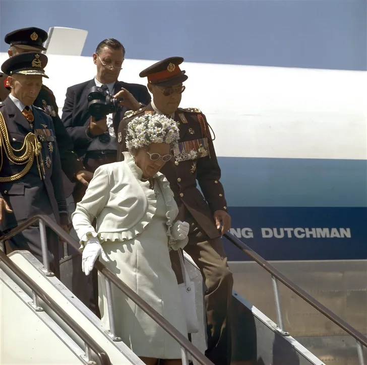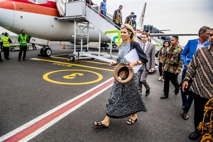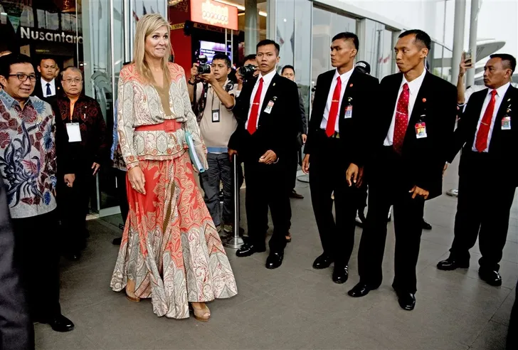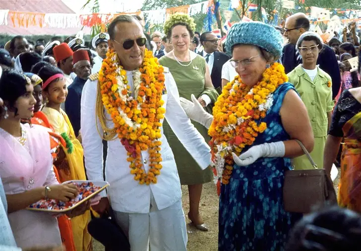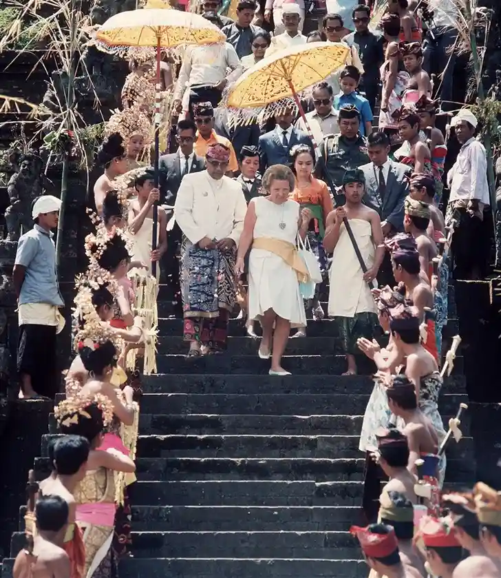 Gezien de lange gezamenlijke geschiedenis lopen de Oranjes de deur bepaald niet plat in Indonesië. Koningin Wilhelmina vond het er te warm en was bovendien bang een tropische ziekte op te lopen, vandaar dat ze nooit een voet op Indonesische bodem heeft gezet. De drie koningen die haar voorgingen, bezochten het land evenmin. Koningin Juliana reisde er als eerste Oranje heen in 1971, toen Indonesië al lang geen deel meer uitmaakte van het koninkrijk. Het ging om een 10-daags staatsbezoek en Juliana arriveerde nog redelijk ingepakt, maar al snel kwam er luchtigere kleding uit de koffer. Bonuspunten voor deze geweldige bloeiende hoed, zo te zien een ode aan haar derde dochter.