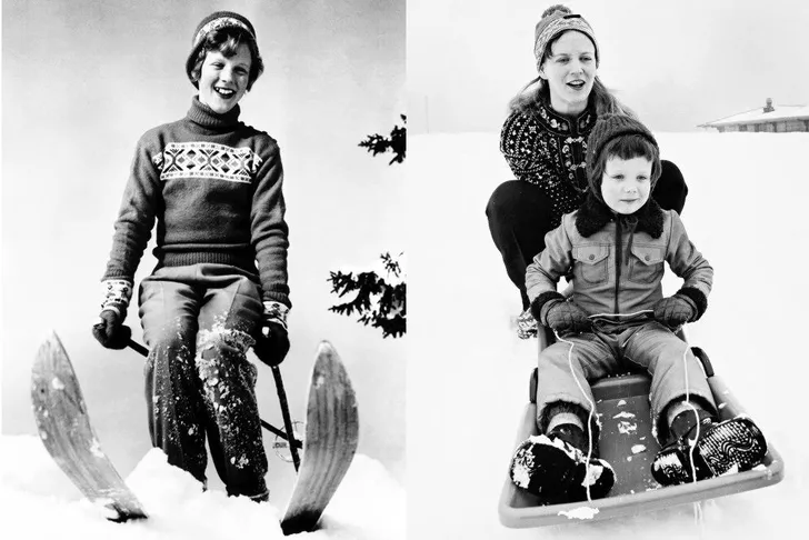 Koningin Margrethe van Denemarken als kind op ski's (links) en rechts met zoon Frederik...