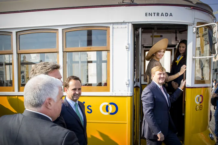 Het was een drukke dag voor Willem-Alexander en Máxima (overdag gehuld in Natan), die heel Lissabon door gingen met de Portugese delegatie. Ze gingen met de tram (zie hieronder), bezochten het Jerónimos-klooster en gingen op bezoek bij de voorzitter van het parlement. Oh, en ze kwamen regelmatig oog in oog met de vele voetbalsupporters die dinsdag óók in zonnig Lissabon waren. Portugal speelde tegen Zwitserland in een kwalificatieronde van het WK. Gelukkig kwam Portugal als winnaar uit de bus, en bleef het dus nog lang gezellig op het staatsbanket.