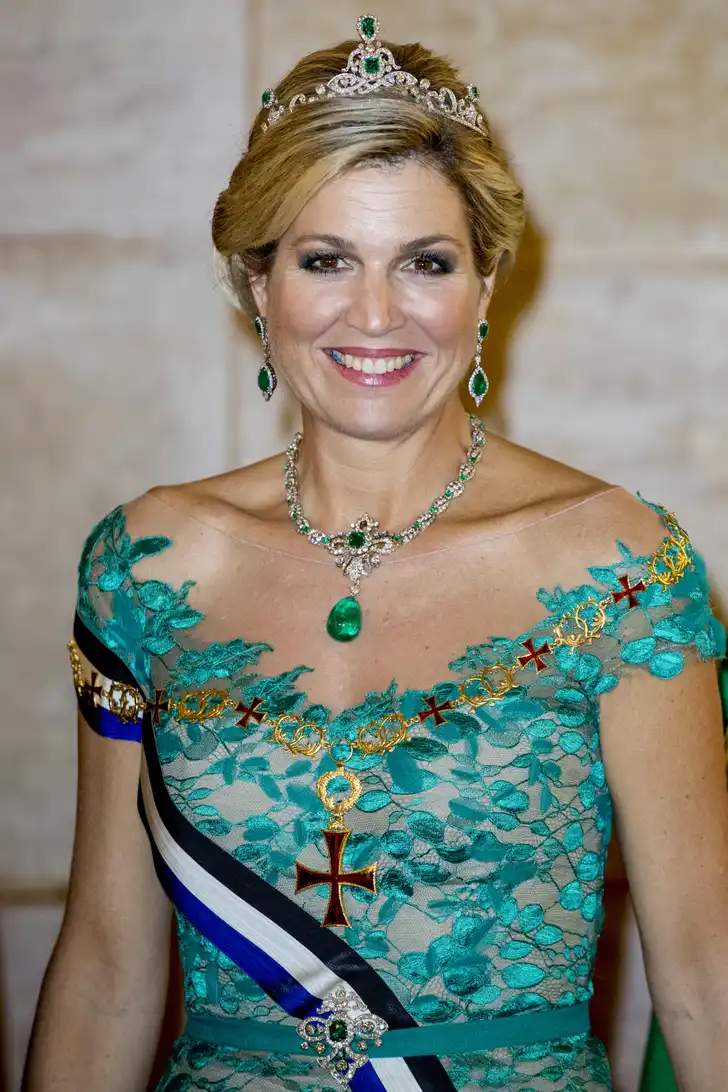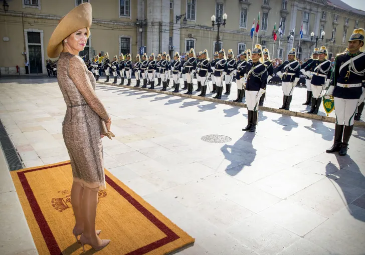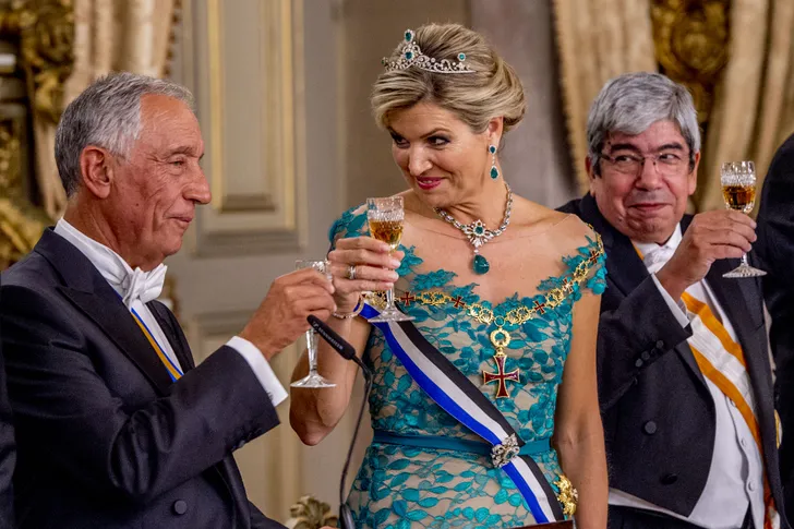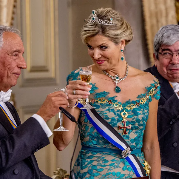 Bij een staatsbezoek mag een staatsbanket natuurlijk niet ontbreken, en waarom we hiermee beginnen is wel duidelijk: wat ziet onze koningin er toch altijd prachtig uit tijdens dit soort chique aangelegenheden. Ze straalde in een al eerder gedragen Jan Taminiau - die alweer opviel in Portugal, want ze droeg bij aankomst in het land op maandagavond ook al een opvallende ketting van de designer - en haar prachtige outfit viel ook de Portugese president op.