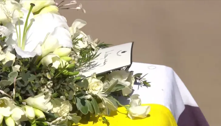 Op de kist Philips vlag, marinepet en -zwaard en witte rozen en lelies, gekozen door Elizabeth...