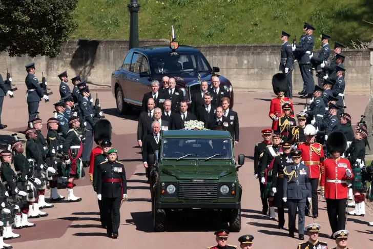 The coffin is carried by a Land Rover designed by The Duke of Edinburgh, & accompanied by Armed Forces representatives, members of the Royal Family, The Duke's Household and The Queen. pic.twitter.com/w0AhnbP95y
