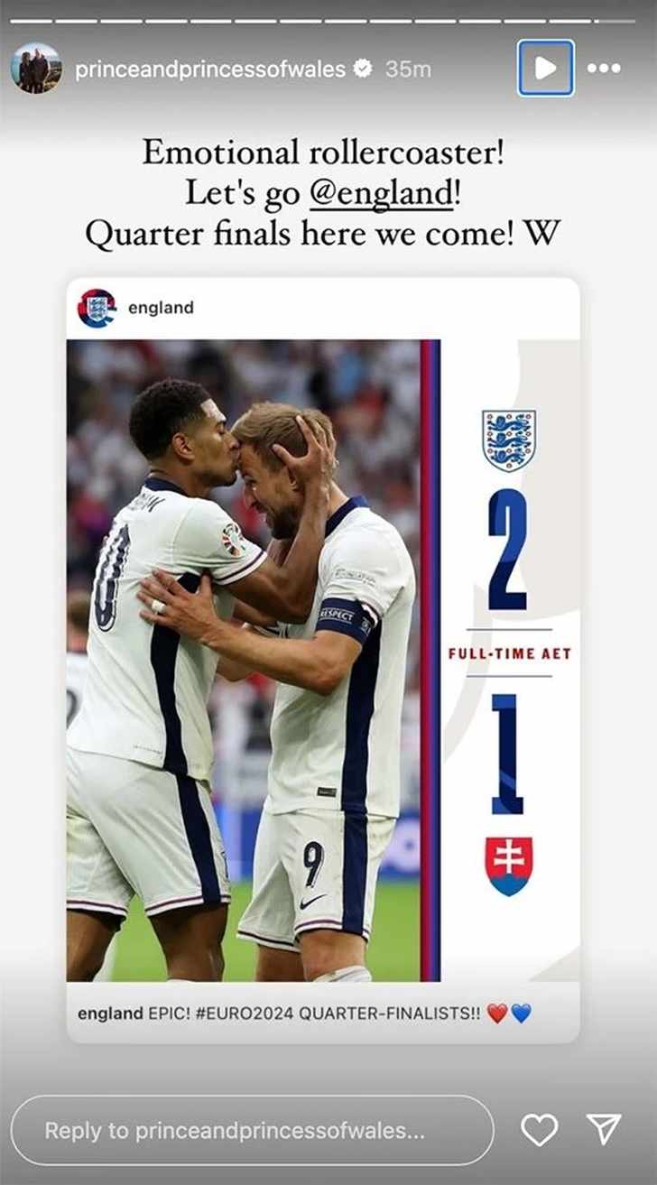 Het advies van Louis heeft het team in ieder geval geholpen, want de Engelsen zijn door naar de kwartfinales. De ploeg stond tot en met de extra tijd 1-0 achter tegen de Slowaken, maar wist het tij in de extra tijd te keren. William kon zijn geluk niet op en wijdde een Instagram-berichtje aan de winst van zijn team. "Emotional rollercoaster! Let's go @england! Quarter finals here we come! W", schreef hij op Instagram.