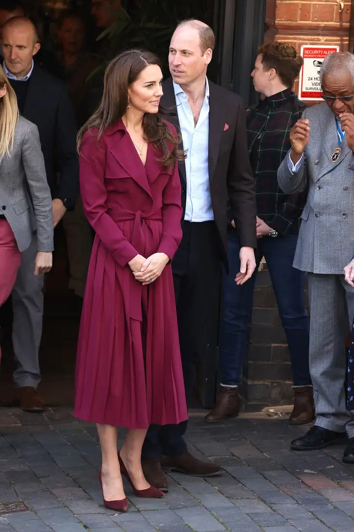 Catherine zag er vrij herfstig uit in een bordeaux jurk van Karen Millen met een plissérok, met oorbellen van Sézane en haar Danielle Draper Gold Citrine Baby Treasure ketting.