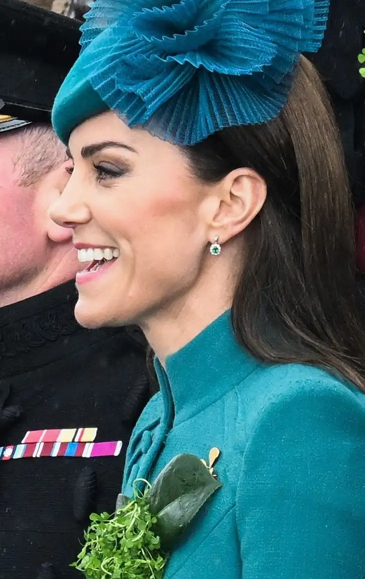 Hoewel haar Catherine Walker look een knipoog naar 'the emerald isle' was, vloekte het zeegroen heerlijk met de bos klaver (shamrocks) waar ze op een dag als St. Patricks Day niet onderuit komt. Hij zat vast met de gouden klaverbroche met daarin een kleine smaragd. Het sieraad is vermoedelijk gemaakt door Cartier in de jaren zestig, de royal van dienst mag 'm lenen. Haar hoed is de Clio van Jane Taylor, hartvormig als een klaverblaadje.