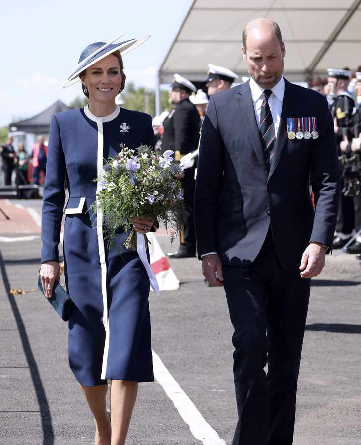 Ze droeg een navy-blauwe coatdress van het Britse merk Suzannah London, met witte details en een flatterend, getailleerd silhouet. Perfect afgestemd op de gelegenheid: de ceremonie rond een nieuw schip van de Britse marine. De outfit werd gecombineerd met een elegante witte hoed van Philip Treacy en nude pumps – allemaal elementen die we kennen van haar kenmerkende stijl in eerdere jaren.