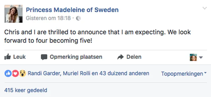 De Zweedse prinses Madeleine heeft trots aangekondigd dat ze haar derde kindje verwacht met echtgenoot Chris O'Neill.
