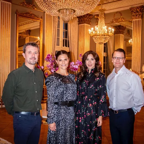 En daarna hadden de stellen een intiem etentje In het Paleis Frederik VIII van Amalienborg. Dresscode: vrienden onder elkaar. Je zou het ook een verre familie-diner kunnen noemen: Victoria en Frederik zijn achterneef en -nicht, ze zijn allebei achterkleinkinderen van koning Gustaf VI Adolf van Zweden (1882-1973).