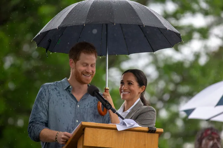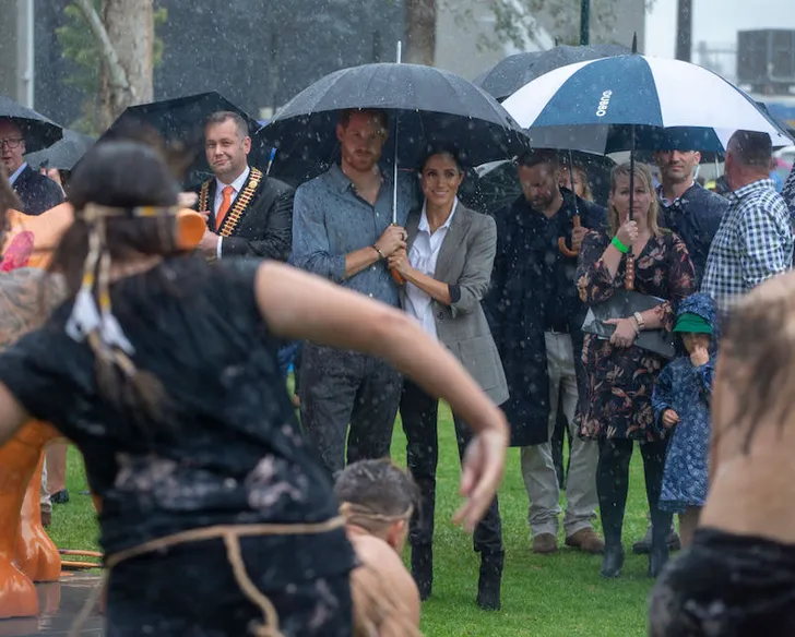 Regenen deed het al heel lang niet meer in Dubbo, Australië. Dus was de verrassing groot dat er, uitgerekend toen Harry en Meghan op bezoek waren, een wolkbreuk plaatsvond. De royals pasten zich gezellig aan aan de barre omstandigheden.